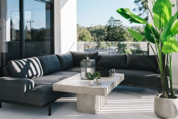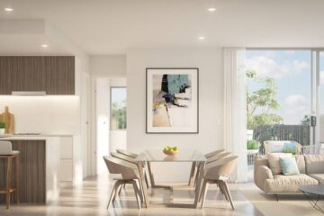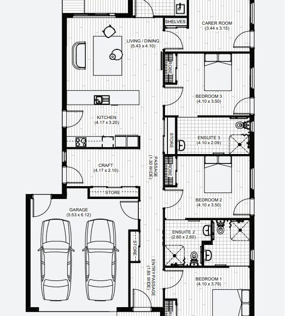The home features three bedrooms, each with its own ensuite and a communal living and dining area.